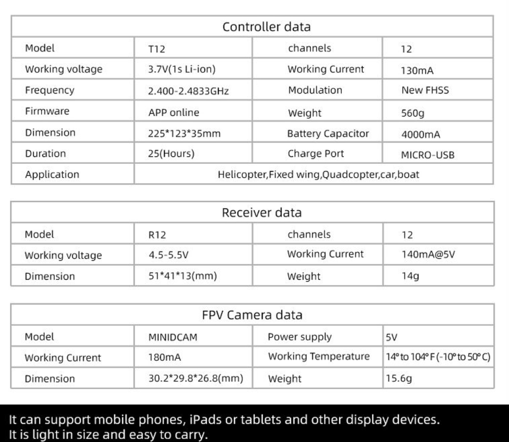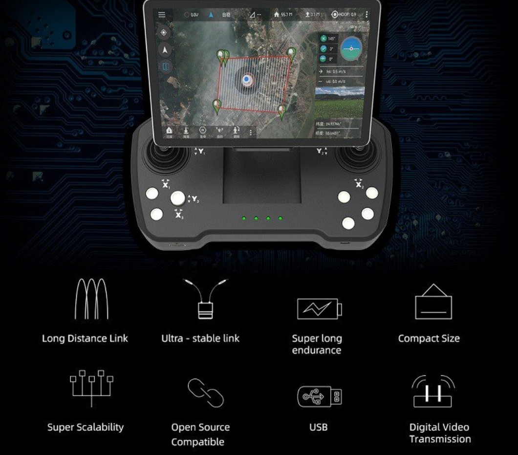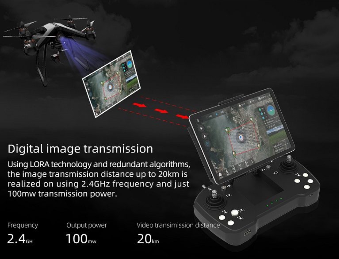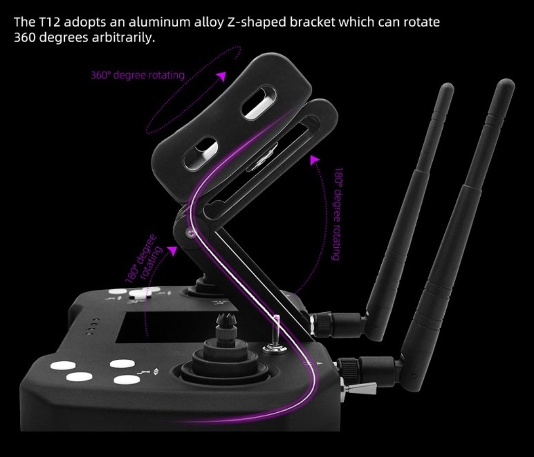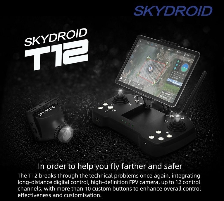 Радиоуправляемый цифровой двенадцатиканальный пульт оснащен встроенными функциями передачи видео и телеметрии. Управление осуществляется на расстоянии до 30 километров, передача видеосигнала возможна на расстояние до 20 километров в условиях прямой видимости. Устройство поддерживает подключение смартфонов или планшетов для отображения видеоизображения. Комплект поставки включает приемник R12 и камеру Skydroid MINI. Настройка пульта и вывод изображений выполняются посредством специальных приложений для операционной системы Android. Благодаря встроенному аккумулятору и прочному корпусу с защитой от пыли и влаги, устройство позволяет эффективно эксплуатироваться даже в неблагоприятных погодных условиях длительное время.