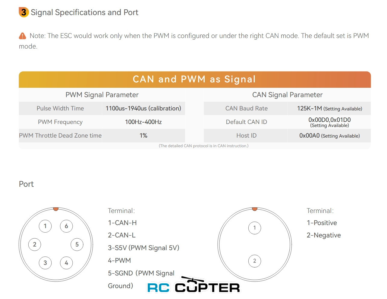 Note: The ESC would work only when the PWM is configured or under the right CAN mode. The default set is PWM mode