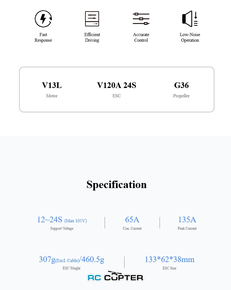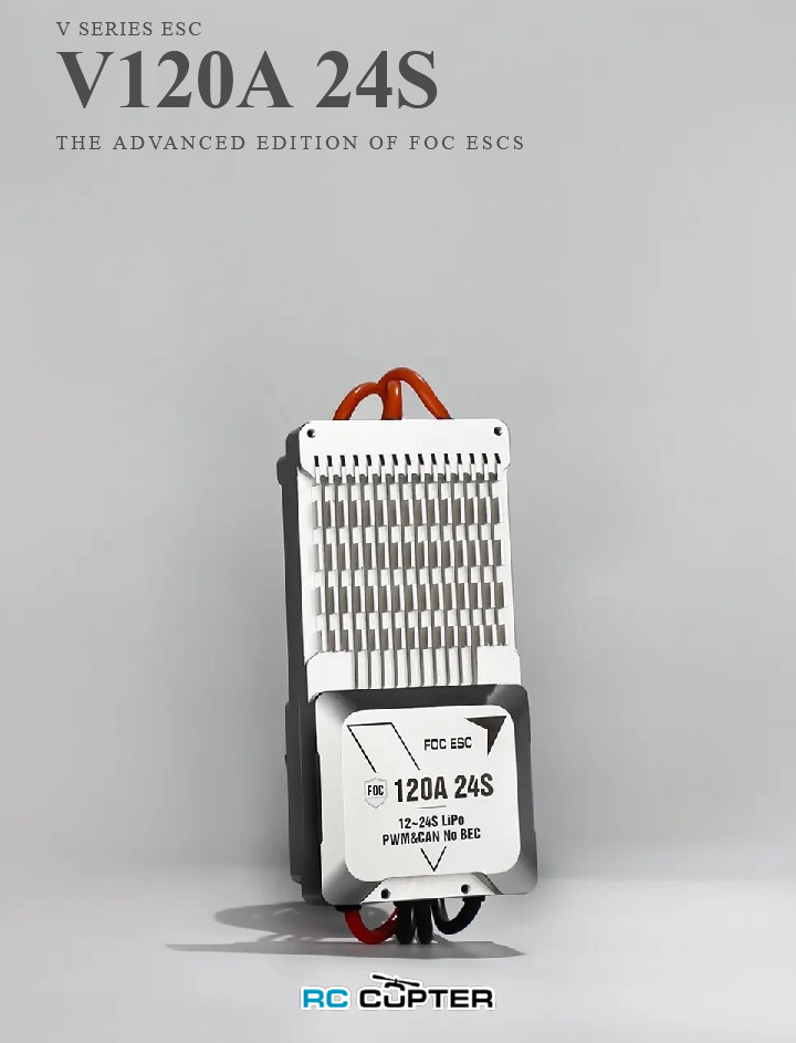T-Motor V120A 24S – продвинутый ESC с быстрым откликом и эффективным управлением. Он поддерживает напряжение аккумулятора 12-24S, обеспечивая продолжительный ток 65А и пиковый ток до 135A.
