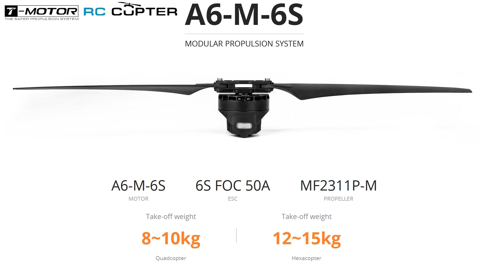 A6-M (Motor)+6S FOC 50A (ESC)+ MF2311P-M (Propellers) |