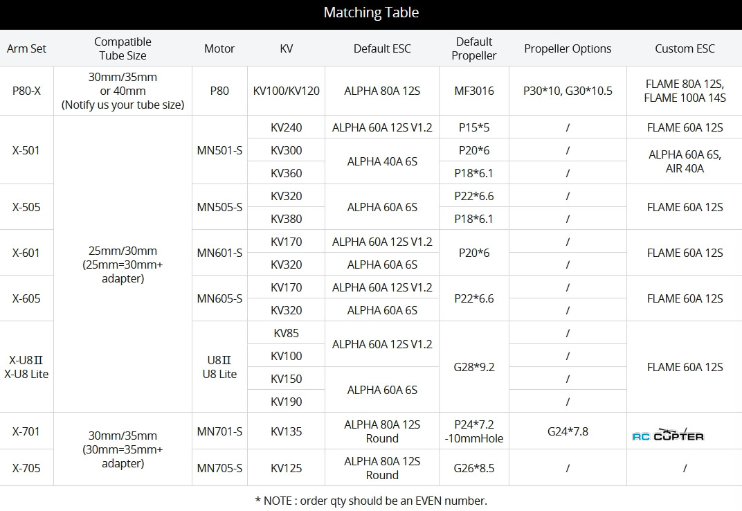 | X-505 | MN505-S | KV320 | ALPHA 60A 6S | P22*6.6 | / | FLAME 60A 12S | |