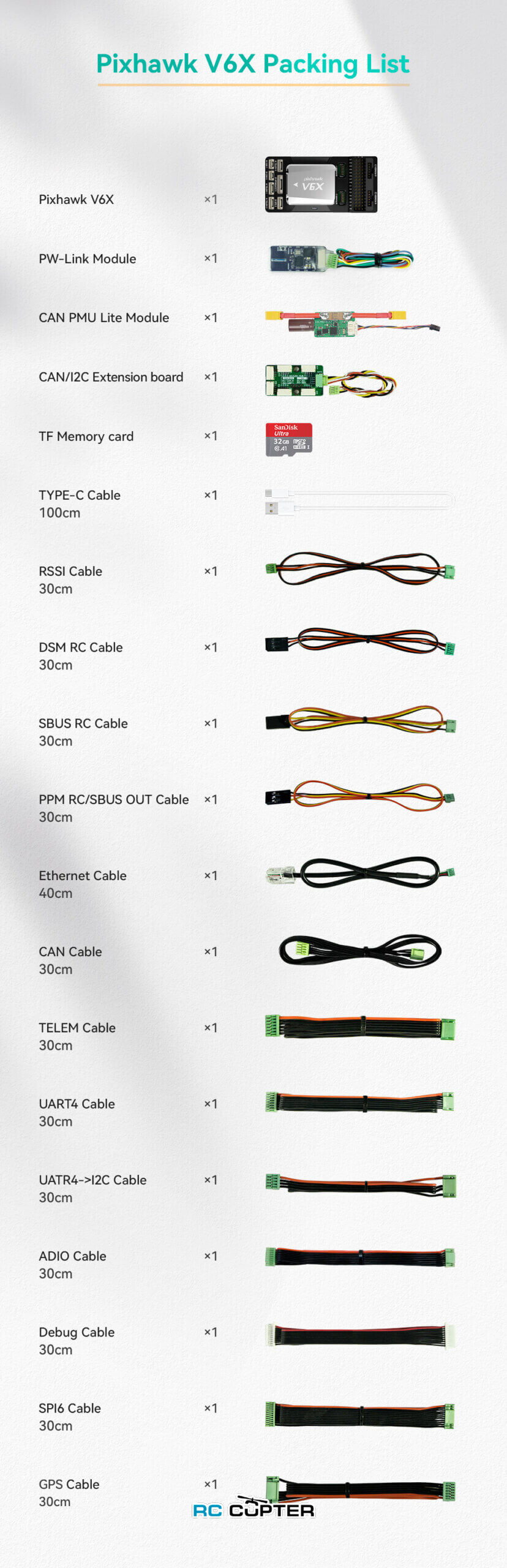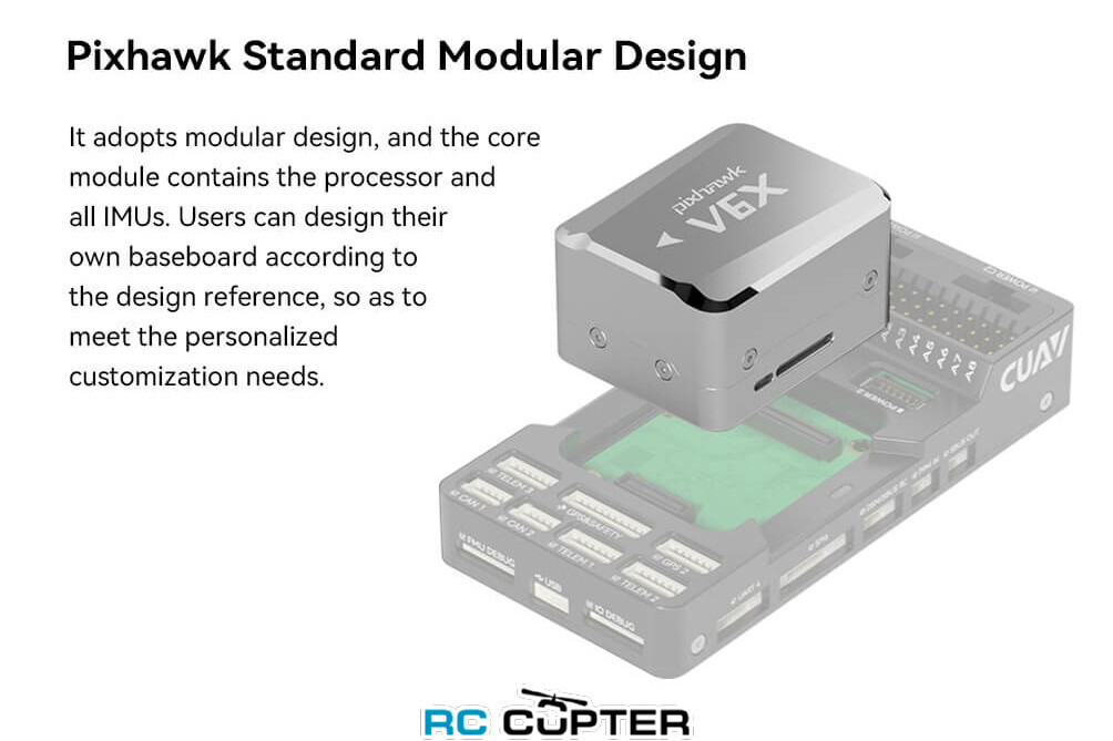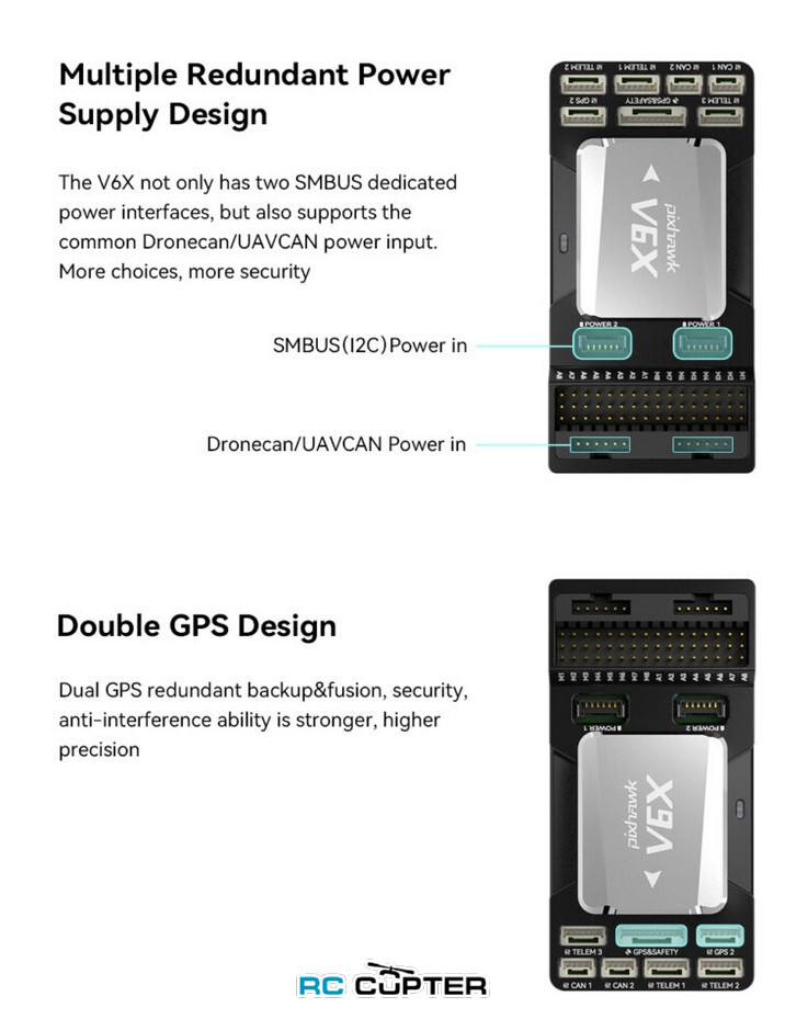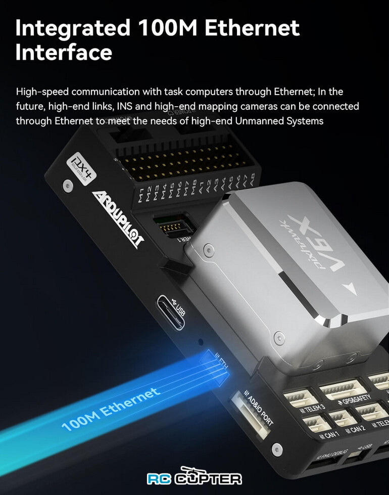 Pixhawk V6X — это новое поколение Pixhawk, разработанное CUAV и PX4; оно создано на основе стандарта Pixhawk FMU v6x и обеспечивает максимальную безопасность и стабильность; в нем используется арифметический блок с двойной точностью H7 и сопроцессор Cortex-M3, независимая шина и источник питания. Три резервных ИМУ, технология заводской предварительной калибровки температуры ИМУ, конструкция с двумя резервными барометрами, всесторонняя гарантия безопасности эксплуатации и богатые возможности расширения; встроенный 100M Ethernet PHY, может связываться с бортовым компьютером (воздушным компьютером), волоконно-оптической инерциальной навигацией, высококачественными камерами для съемки и картографирования и другим промышленным оборудованием, установленным на беспилотных системах, для высокоскоростной связи, что отвечает потребностям высококачественных приложений.