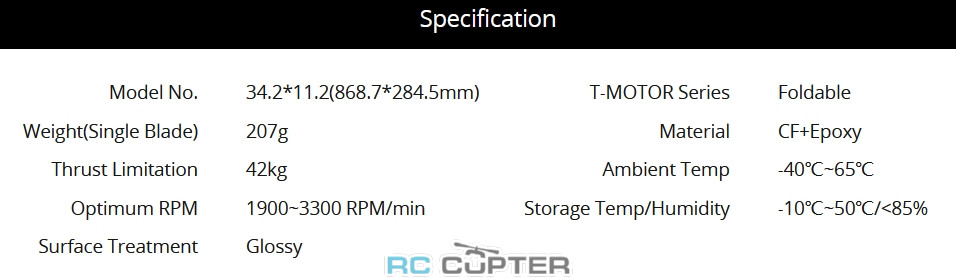 | Model No. | 34.2*11.2(868.7*284.5mm) | T-MOTOR Series | Foldable |