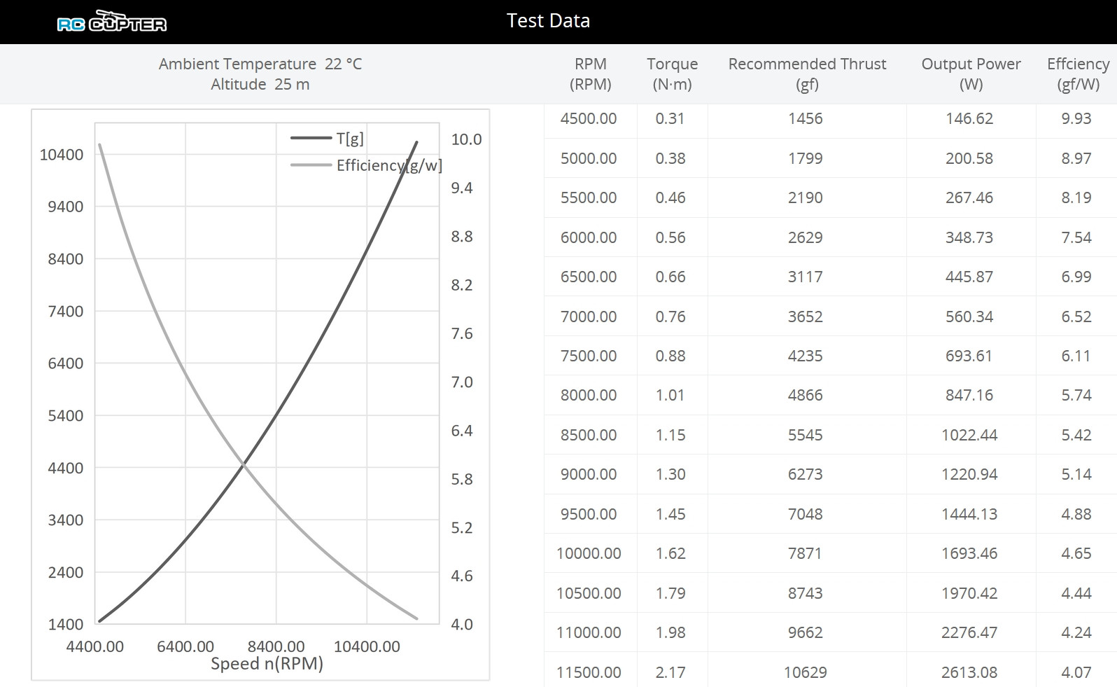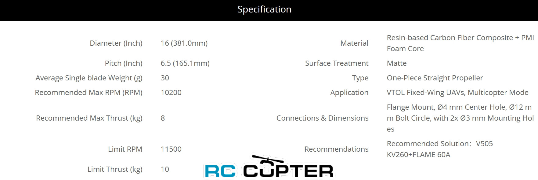 | Лимит RPM (обороты) | 11500 RPM | Рекомендации по оборудованию | Мотор T-Motor V505 KV260 + ESC FLAME 60A | |