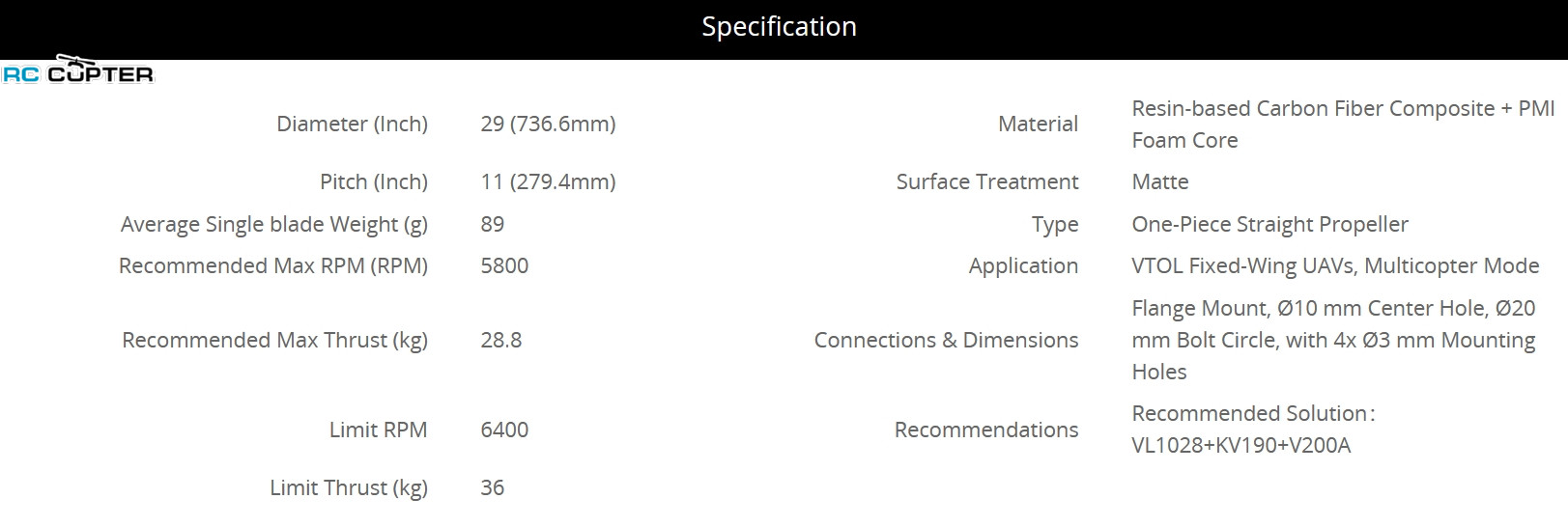 | Рекомендуемая макс. RPM (обороты) | 5800 | Применение | VTOL Fixed-Wing UAVs, Multicopter Mode (БПЛА с неподвижным крылом VTOL, режим мультикоптера) | |
