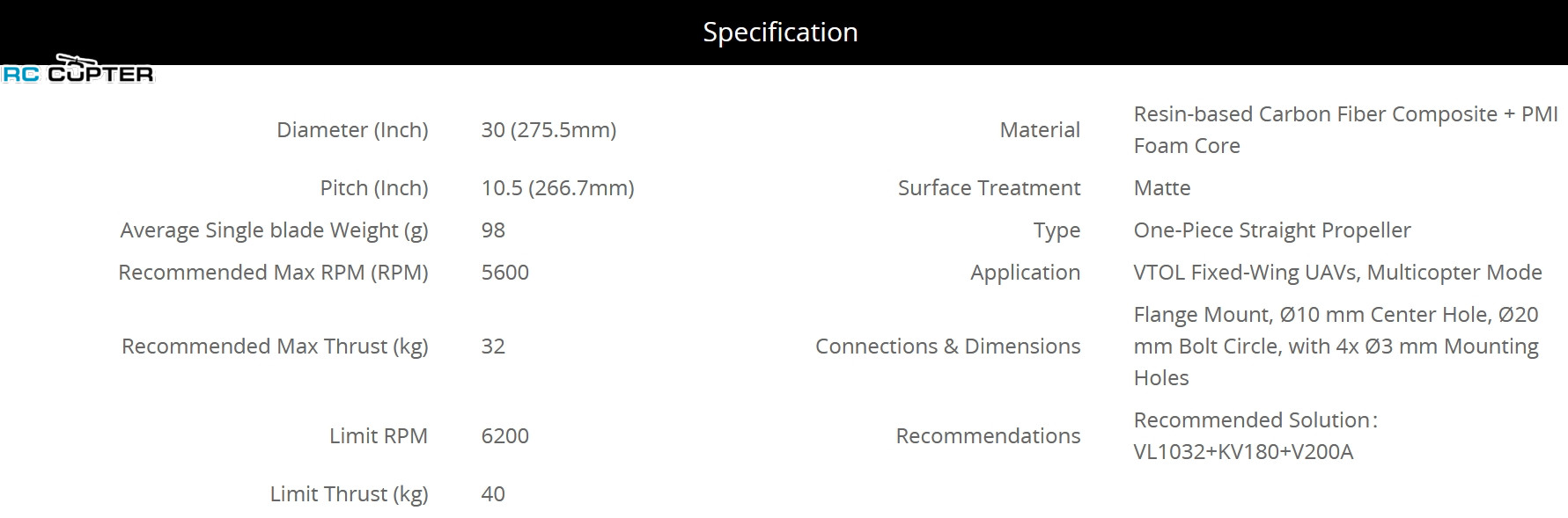 | Рекомендуемая макс. RPM (обороты) | 5600 | Применение | VTOL Fixed-Wing UAVs, Multicopter Mode (БПЛА с неподвижным крылом VTOL, режим мультикоптера) | |