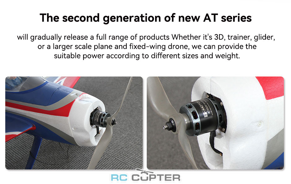 T-Motor AT2814 специально разработан для самолетов с фиксированным крылом весом 1,3-1,4 кг, предназначенных для 3D-пилотажа, F3A и БПЛА, с максимальной тягой 2,2 кг.