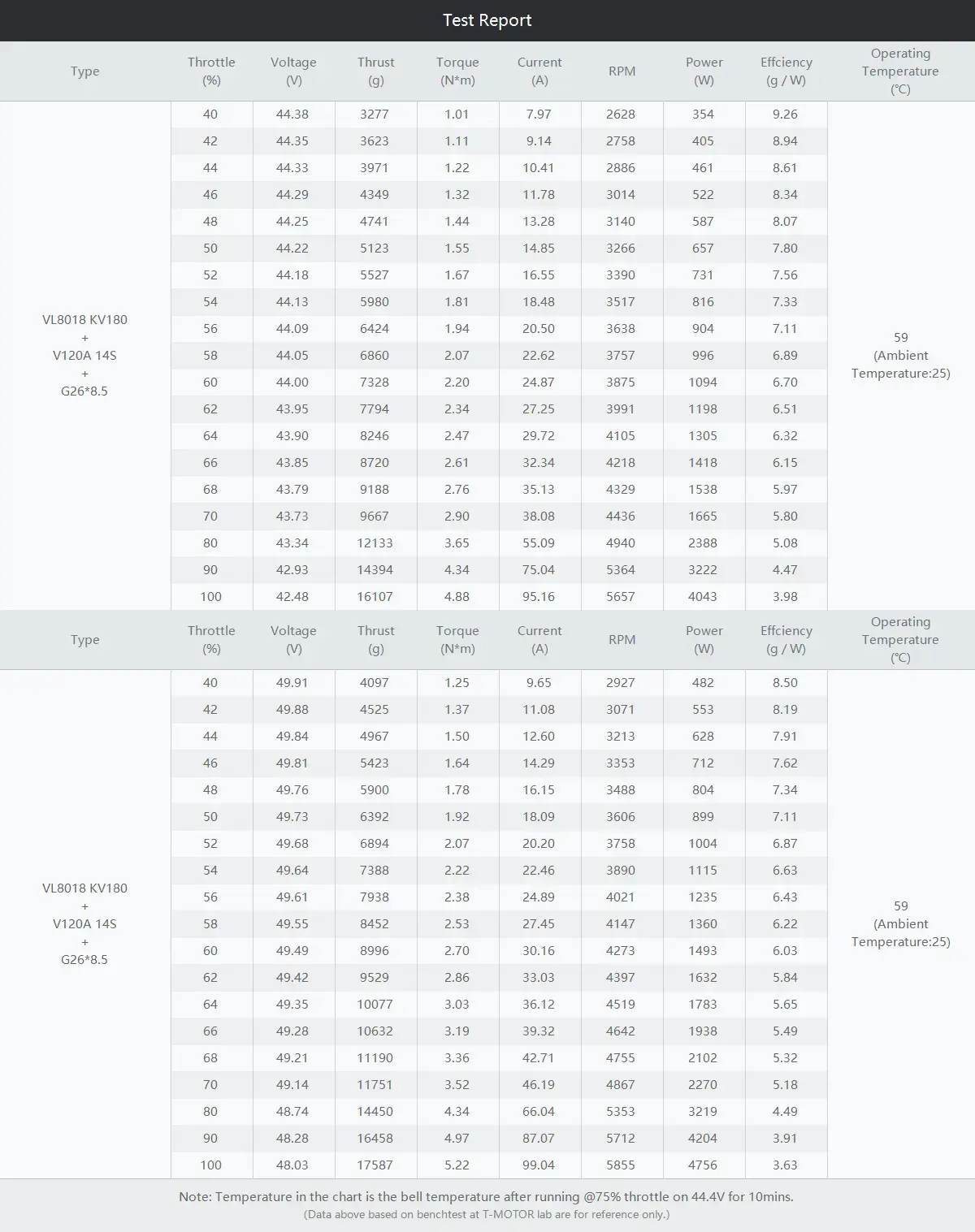 | Note:Temperatureinthechartisthebelltemperatureafterrunning@75%throttle on 44.4V for10mins. (Date above based on benchtest are for reference only,comparion with that of other motor types is not recommended.) |