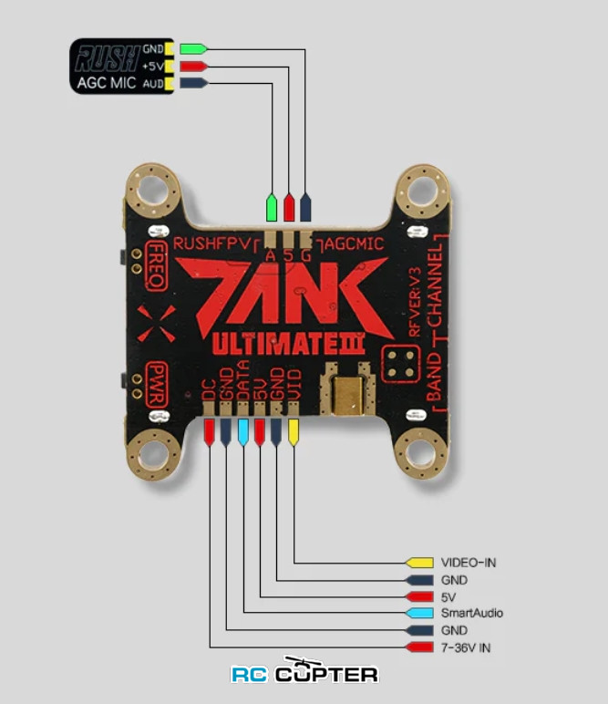 В этот VTX встроен протокол SmartAudio, авторизованный TBS. С помощью обычных двойных кнопок можно настроить RGB светодиоды, а затем получить доступ к настройкам SmartAudio ti и просмотреть информацию о VTX через экранное меню.