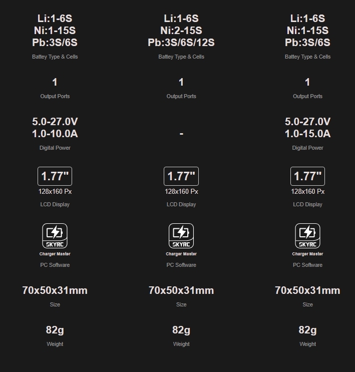 - LiPo/LiFe/LiIon/LiHV: 1-6 элементов