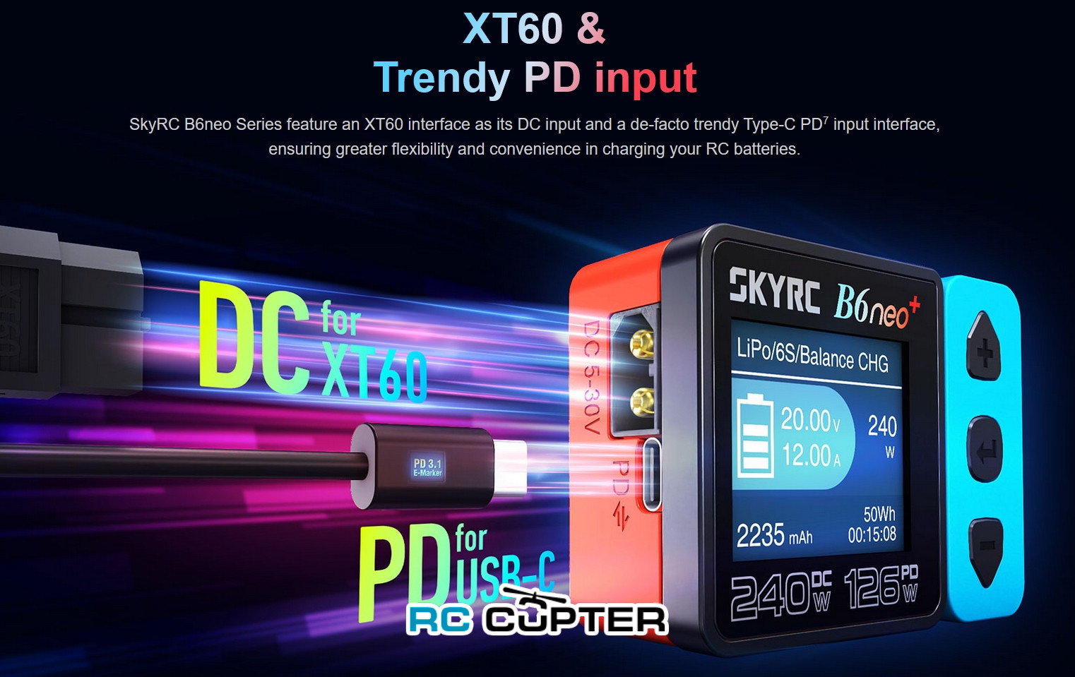 Работает от постоянного тока (DC) от разъема XT60 или USB-C (PD3.0/3.1)