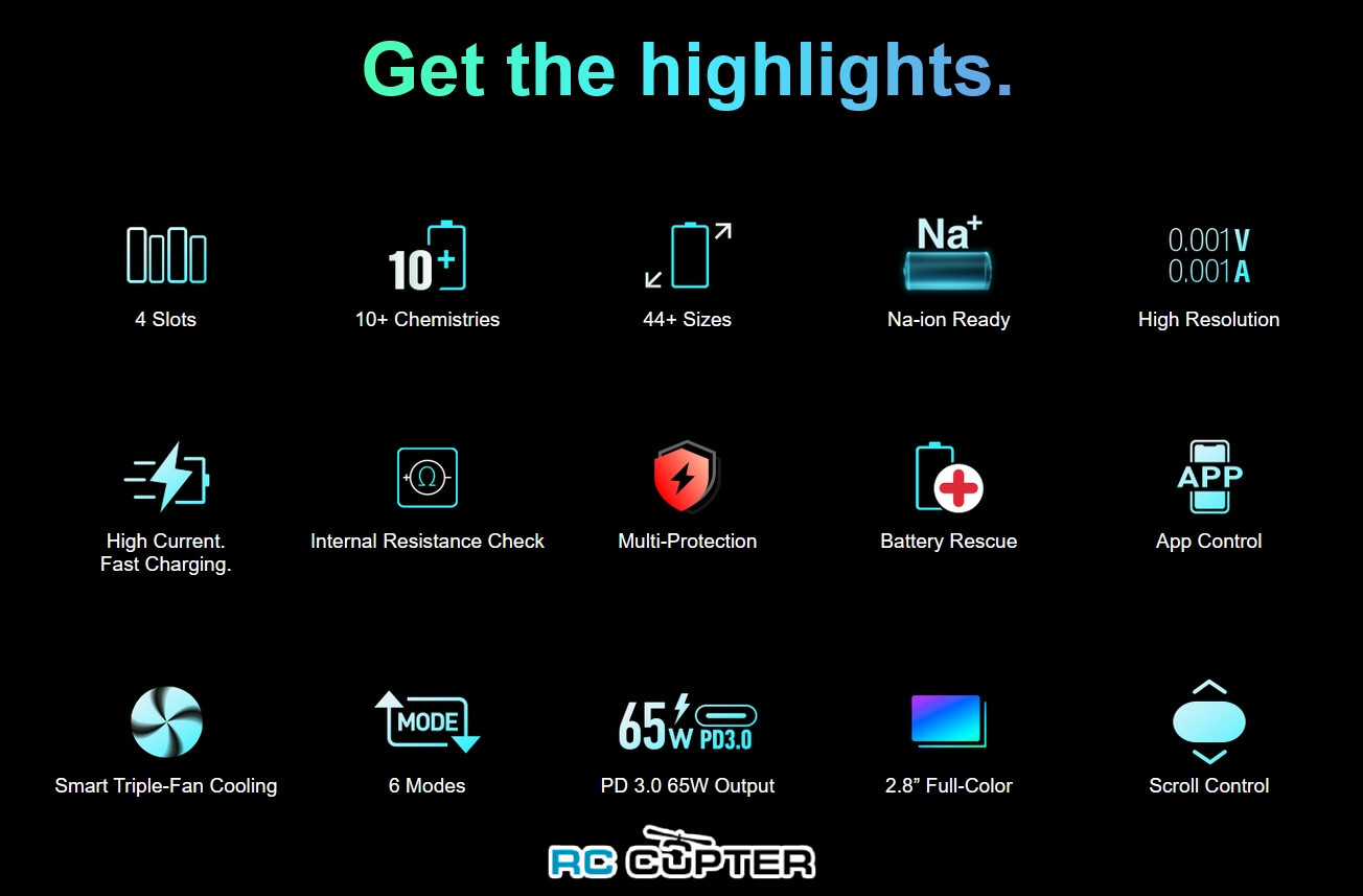 - Тип аккумулятора: литий-ионный, литий-ионный HV, LiFe, NiMH, NiCd, eneloop, NiZn, RAM, LTO, Na-ion