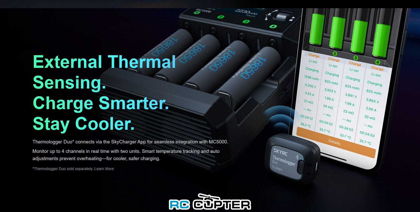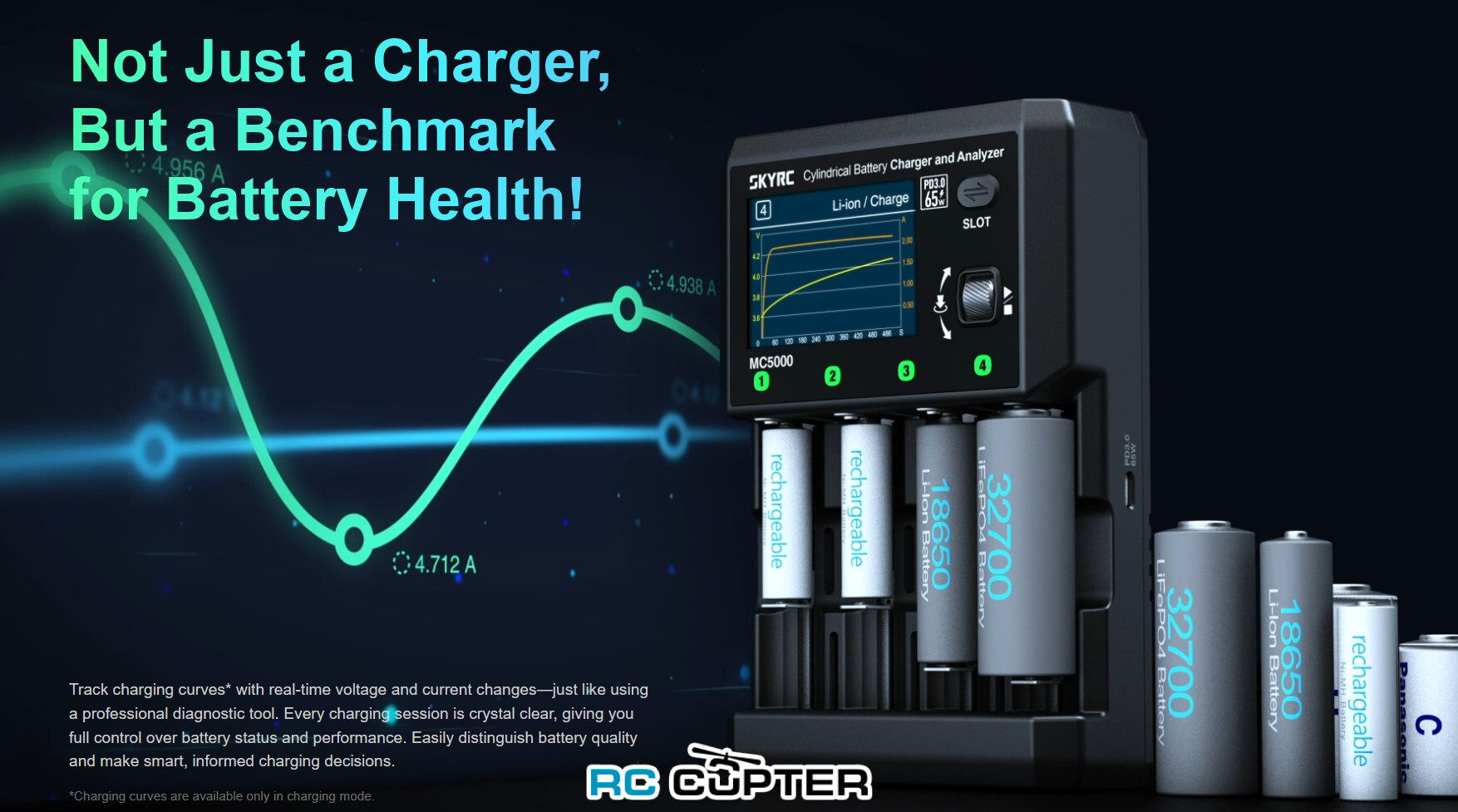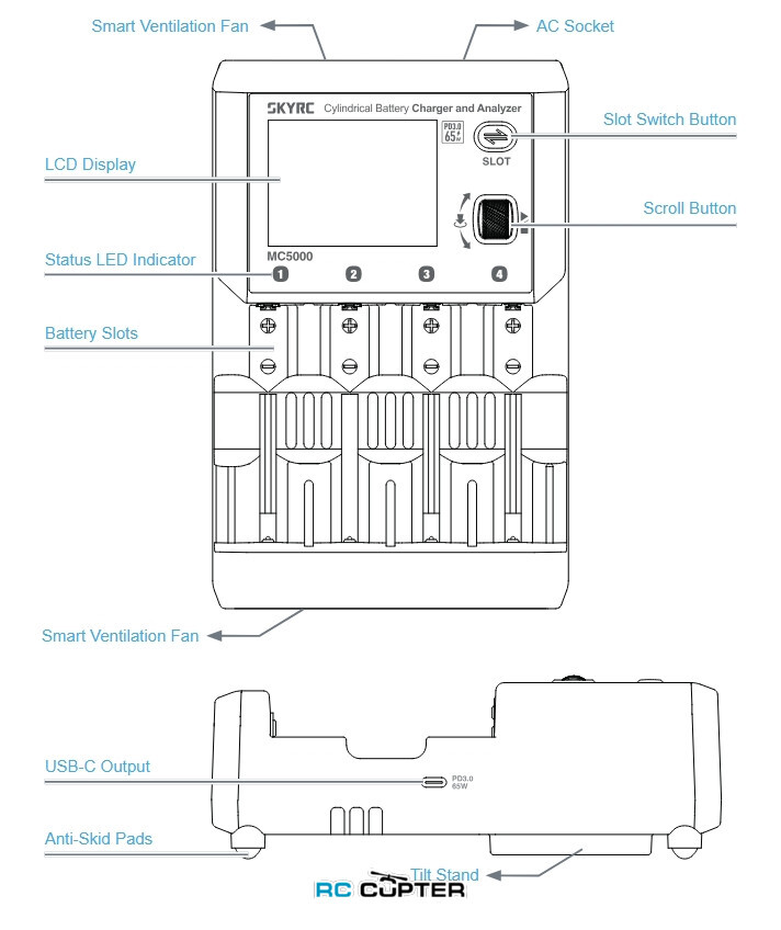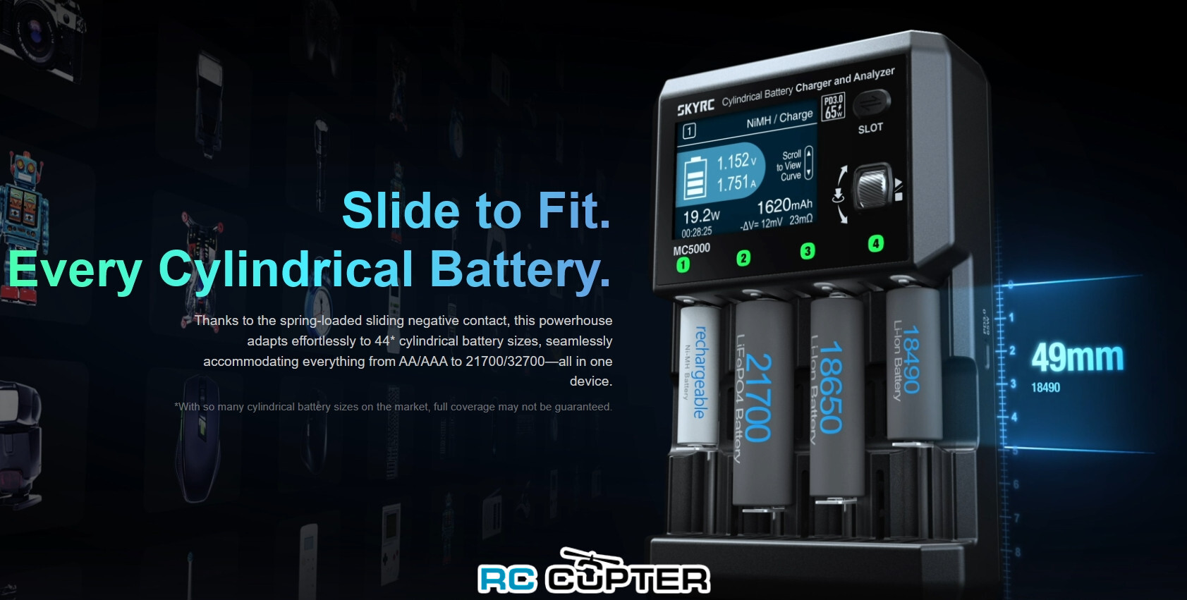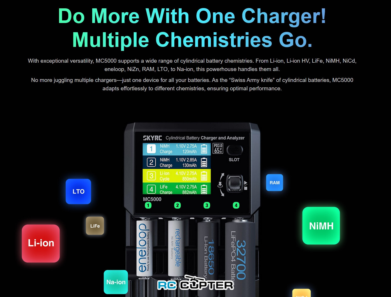 Зарядное устройство SKYRC MC5000 PD65W для цилиндрических аккумуляторов с управлением через приложение для литий-ионных, литий-ионных HV, LiFe, NiMH, NiCd, Eneloop, NiZn, RAM, LTO, Na-ion аккумуляторов