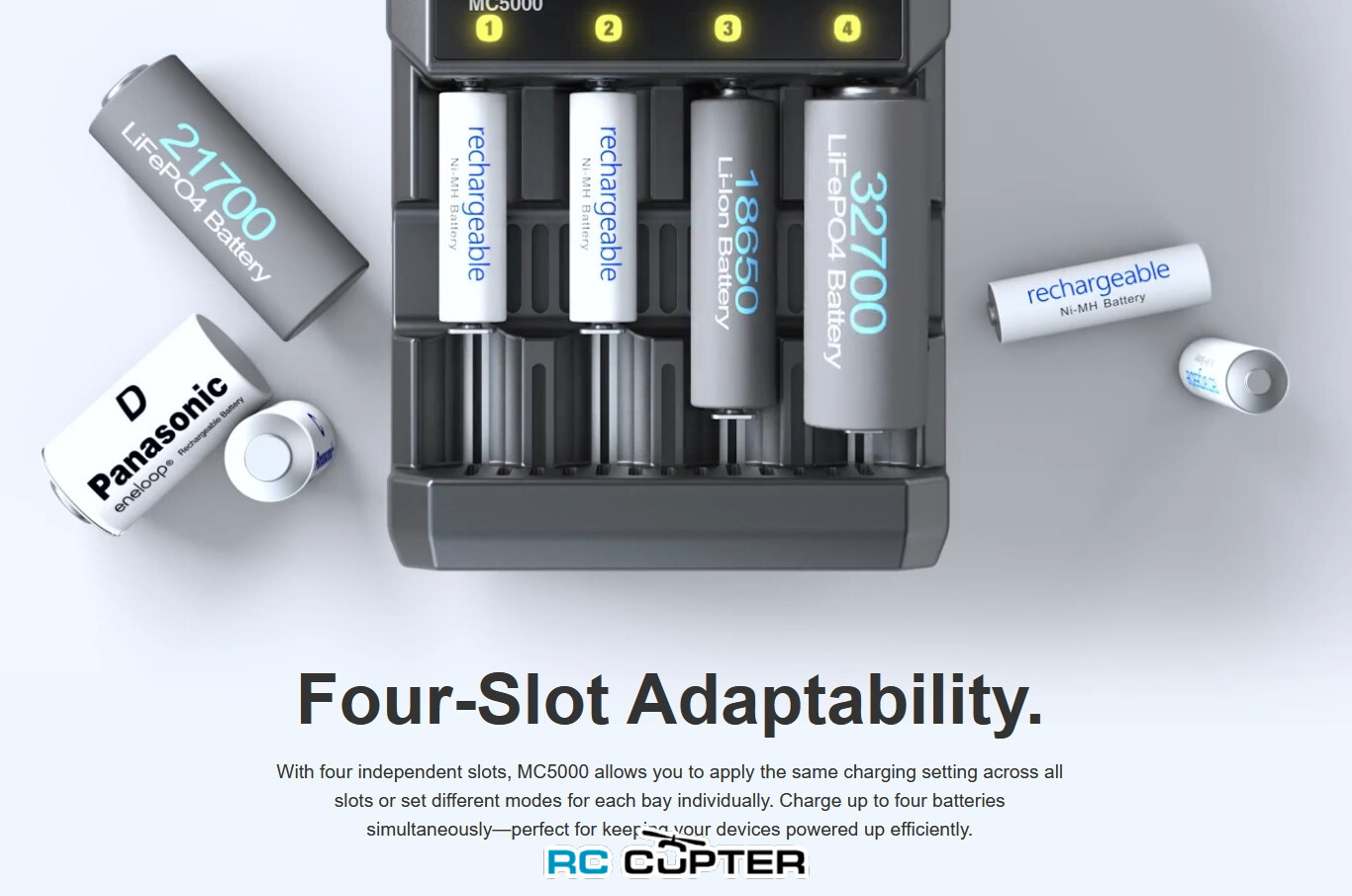 MC5000 с четырьмя независимыми слотами позволяет применять одинаковые настройки зарядки ко всем слотам или устанавливать разные режимы для каждого отсека индивидуально. Заряжайте до четырех аккумуляторов одновременно — идеальное решение для эффективной зарядки ваших устройств.