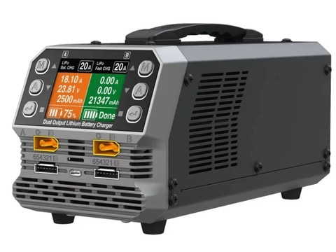 SkyRC PC1080 - двухканальное зарядное устройство 6S LiPo для беспилотников промышленного назначения. Оно надежно, безопасно и просто в эксплуатации, а также обладает широкими функциональными возможностями, такими как измеритель напряжения батареи, измеритель внутреннего сопротивления, режим зарядки LiHV, а также режим синхронизации с экономией времени.