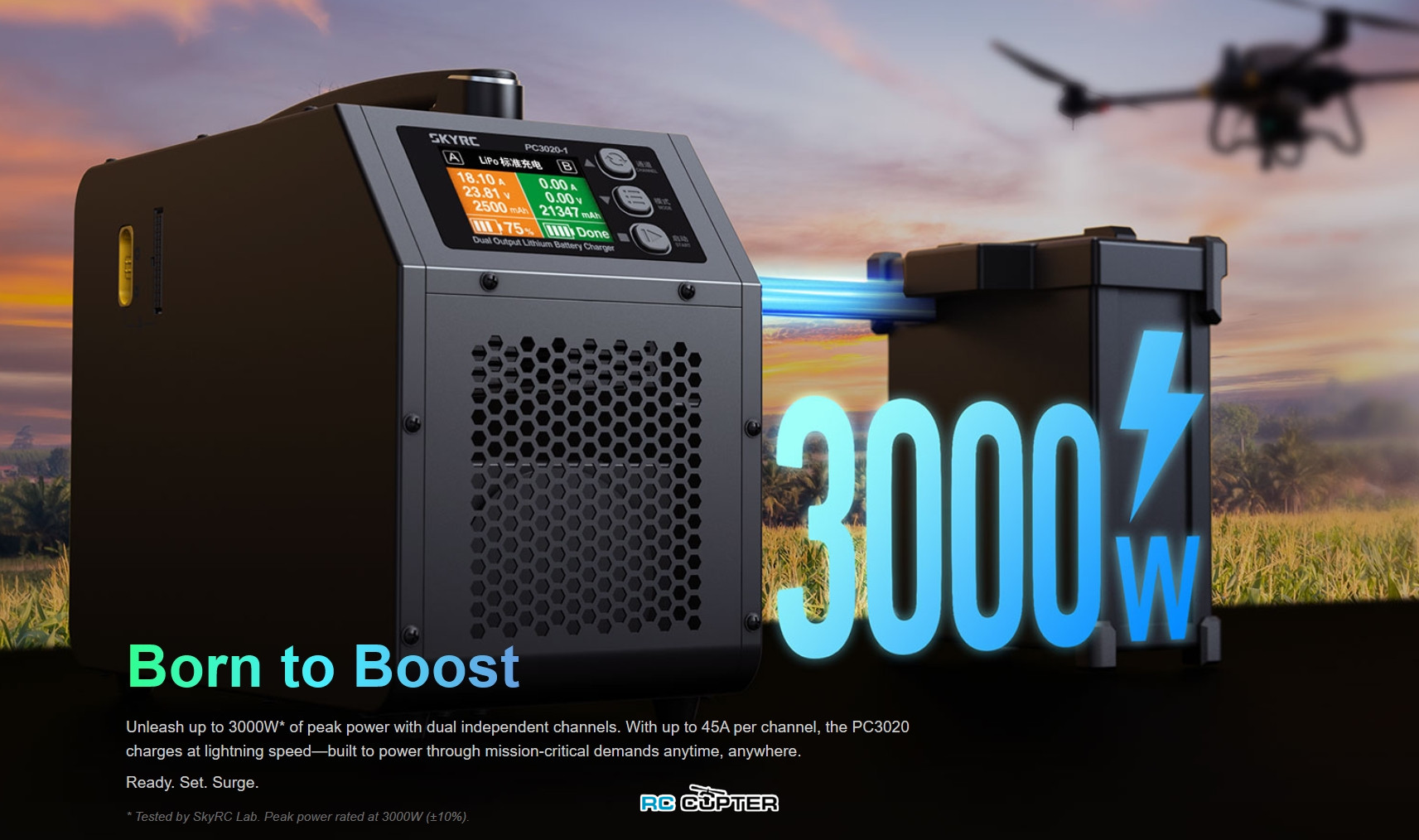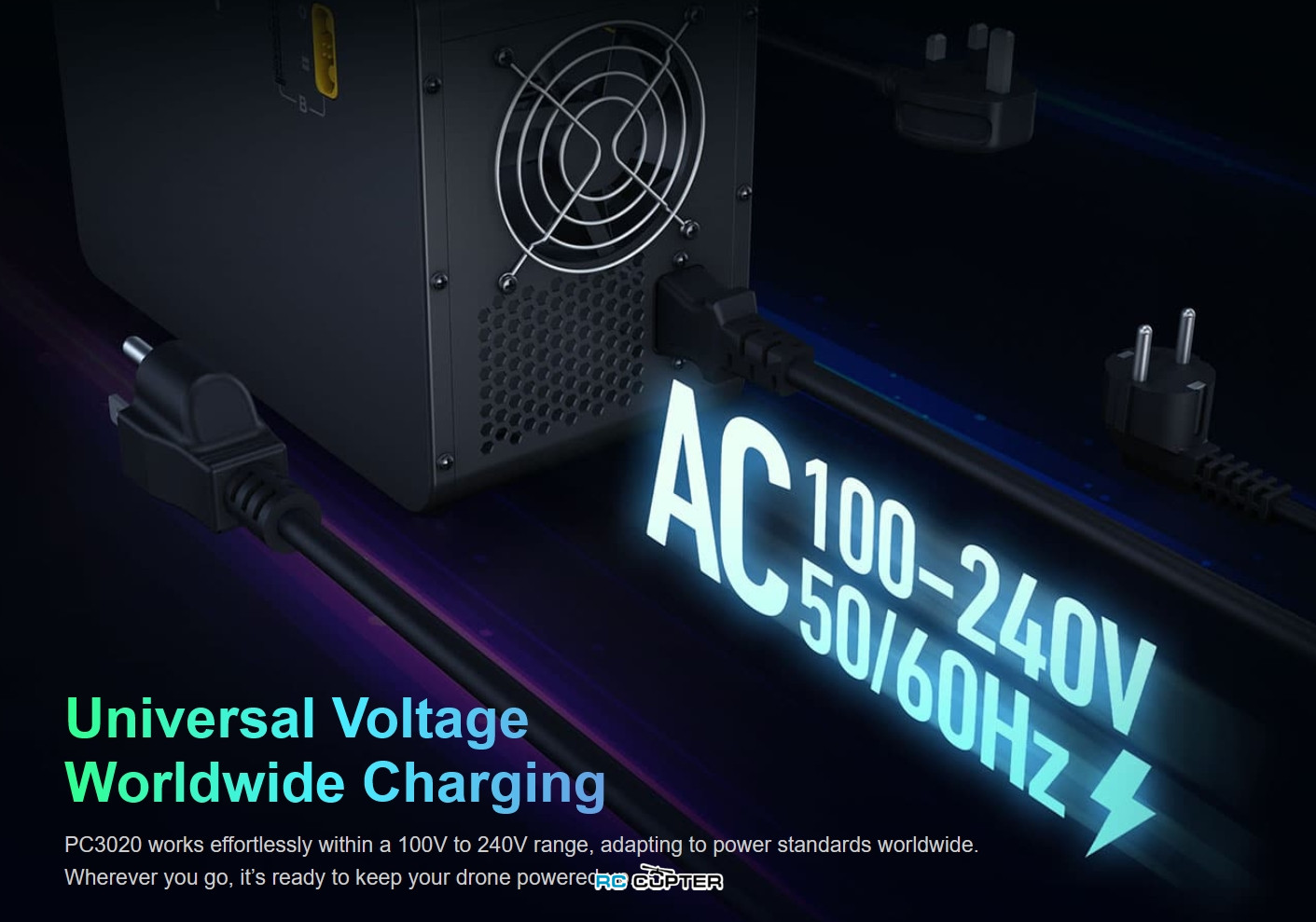 PC3020 — двухканальное зарядное устройство, разработанное для промышленных дронов, которое обеспечивает точное, надежное и интеллектуальное зарядное устройство для батарей 12–22S.