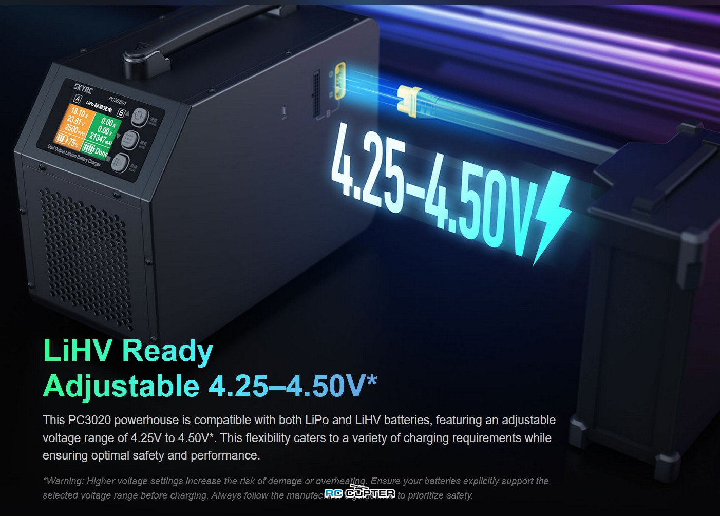 Этот мощный зарядное устройство PC3020 совместимо с батареями LiPo и LiHV и имеет регулируемый диапазон напряжения от 4,25 В до 4,50 В*.
